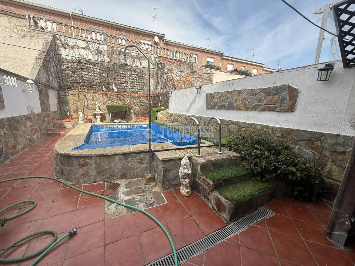 - Patio trasero con piscina y barbacoa .